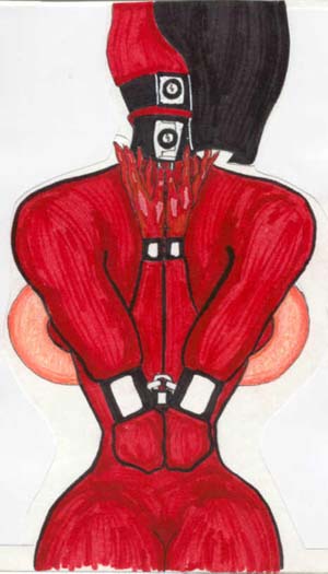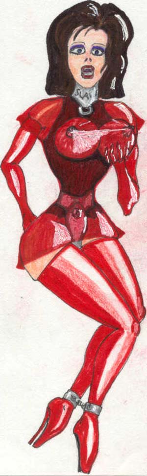 After work, sometimes on a weekend or holiday, Celia would work on her pet project. Her masterpiece was to be an all-in-one fetish costume, one that would fit her exactly; a second skin, but one you could still remove. The material she was working with was glossy, patent red, somewhat stretchy and supple. She found that by increasing the thickness of the material in key areas and applying heat, it would become stiff and unyielding. After much programming, she was ready to give her latest effort a try. She had previously had the computer scan her body, using its precise measurement lasers. She had used the CAD program to create a three-dimensional model of what she wanted the skin generation unit to create, down to exact thicknesses, material compositions, and selected “cook” areas, that would be subjected to high heat to alter their makeup. The only thing the machine didn’t create was the titanium alloy insteps with their attached eight-inch high-heels. Celia had these made for her (at considerable expense) at a metal fabrication shop.