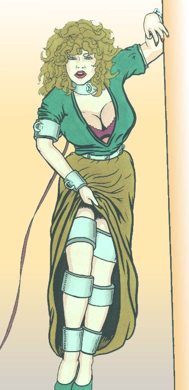 These newest adornments and restraint appliances consist, as you can see, of the following articles. First, I have a pair of wrist bracelets, and these are 10 centimetres wide and a full half centimetre thick! They’re made of a very specialized type of stainless steel, and are lined with deep-penetration nanites so that they are solidly locked into my underlying flesh and bones. Naturally, these bracelets, as do all of our new line, come with two sets of freely swinging, universal joint mounted restraint rings!