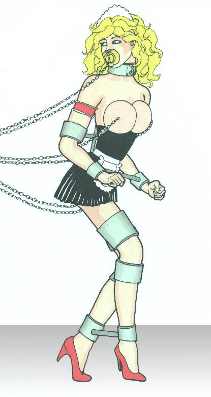 Melanie now wears a 60 centimetre long wrist separator bar, all the time, and this is a very strict device! It renders her almost completely helpless. In addition she’s also required to wear a very short thigh bar that ensures her legs are kept spread all the time, and below, her knees are kept spread even further apart by a longer bar! Her ankles are separated even more by a bar that is longer yet, so at no time now is she able to close or cross her legs, in any manner! She is constantly available and vulnerable, while at the same time utterly secure! You’ll see that Melanie’s elbows are pulled closely together behind her back with another short bar, and ... turn again please dear ... you’ll notice that it is only the cross stroke of an upside down ‘t’ formation! At the top, it’s connected to the back of her collar, then there are her elbow restraints, and finally, the bottom portion is connected to the external ring of her Anal Chasti-Lock!