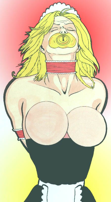 But, you ask, what do all of these look like after they’re fitted? Well, we’ve brought back Melanie (remember her?) to show you what they look like, all joined together! Janet? Will you go back to the Holding Cell ... er, sorry ... Holding Room, and bring Melanie out here, please? Thanks! Just hang on for a minute, ladies, Melanie is pretty slow-moving, now that she’s wearing her new appliances. And, by the way, since you saw her last, Melanie is now also wearing what I soon will be: the oral, nasal, and anal Chasti-locks!